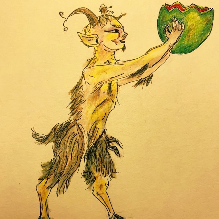 A book of fairy tale illustrations I have, a collection of magical watercolor and ink drawings by Arthur Rackham, inspired this and other drawings. The yellow-ish faun on the upper left hand side is holding a cut watermelon. The original offers up a donkey’s head, destined for Bottom, a character in Wm. Shakespeare’s A Midsummer Night’s Dream. Why a watermelon? Well, it’s summer and I didn’t feel like drawing a donkey’s head.