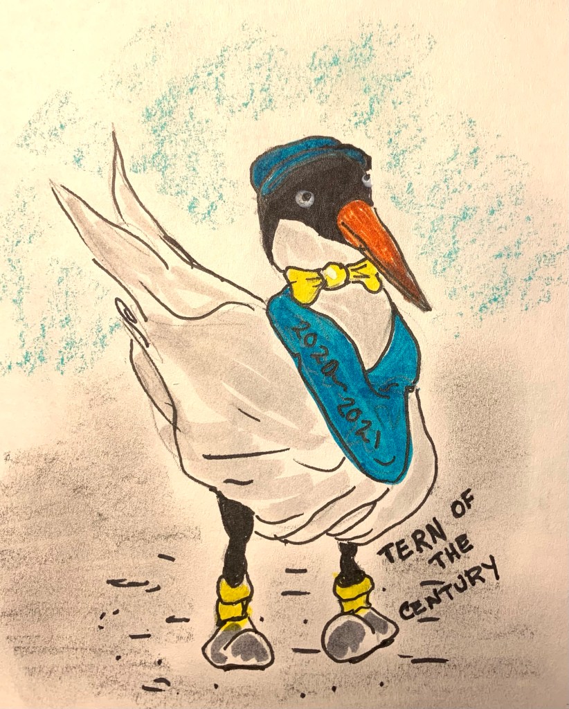 Something about that word tern that drives me to punning. Terns, related to gulls, often look as though they are up to something. David Allen’s beautiful and informative new book, What It’s Like To Be A Bird says that Arctic Terns are so well adapted to flight they travel from the Arctic to Antarctica and back, 60,000 miles a year. Attention must be paid here, to paraphrase Arthur Miller. Below I offer more tern puns.