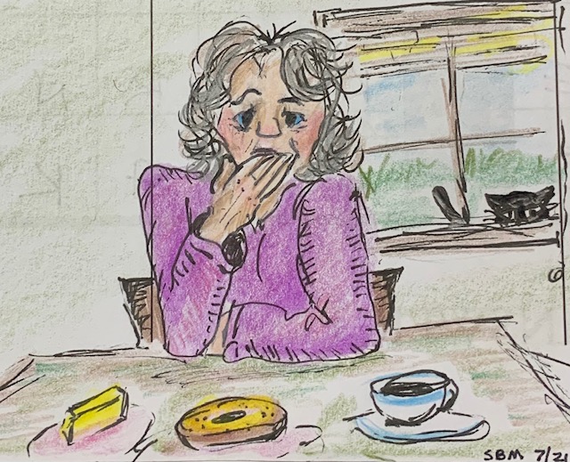 Toward the end of the month, the impossible became possible. Her friend called. “Let’s meet for breakfast. It’ll be in the 70’s and no wind. I know a place with a patio, great coffee, and we can catch up in person, now that the restrictions have been lifted. Of course, if you are more comfortable with a mask…”