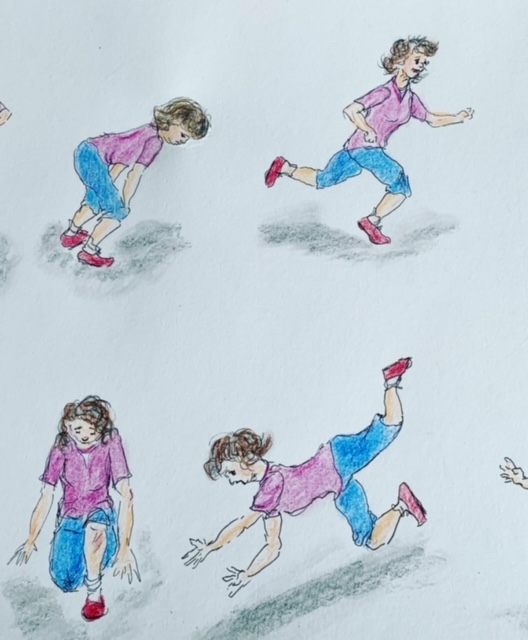 Early in the morning, she beat the heat at its oppressive game and followed her usual path around city parks. Mind wandering among the swinging vines of her imagination, she missed an upheaved sidewalk and fell. Her elbows and knees bore her only, albeit superficial, wounds. She righted herself and kept going.