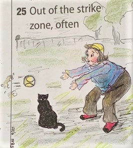 Although my Gerty drawings are not self-portraits, they do sometimes externalize my feelings, reactions, and aspirations. Here are a few of my earliest sketches of Gerty with her feline friend. Two were drawn in the margins of a crossword puzzle book. Another shows Gerty in a softball game when her cat arrives at the worst moment.