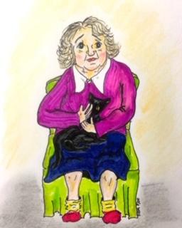 Ah, in those times, I drew Gerty a lot and often with her black cat who, like ours, would peek out from behind her legs or perch on some of her furniture. I suppose the cat in Gerty’s setting is a symbol of comfort and calm. Cat-lovers understand. Cat-detesters will scratch their heads.
